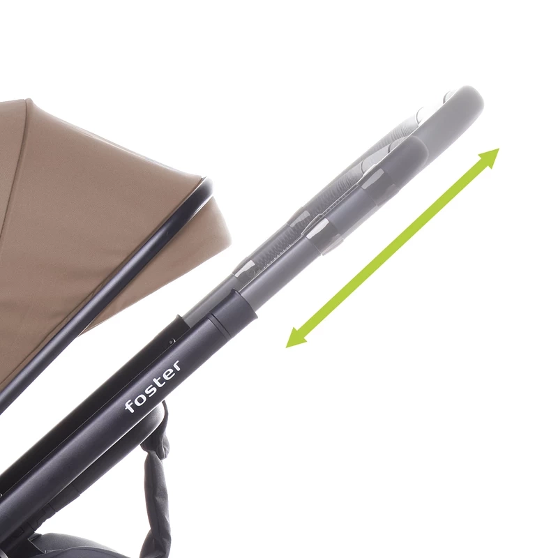 Foster oferuje trzystopniową regulację oparcia, umożliwiając ustawienie od pozycji siedzącej aż do leżącej. Czterostopniowa regulacja podnóżka pozwala dostosować wózek do wzrostu dziecka i jego potrzeb. Teleskopowa rączka z eleganckim, skórzanym wykończeniem zapewnia wygodne prowadzenie wózka przez osoby o różnym wzroście.
