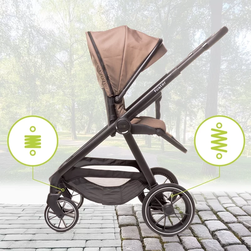 Model Foster wyposażono w amortyzację z przodu i z tyłu, co zapewnia płynne prowadzenie nawet na nierównych nawierzchniach. Duże koła pokryte gumową powłoką nie wymagają obsługi, a ich doskonała przyczepność i zwrotność ułatwiają prowadzenie wózka w każdej sytuacji. Przednie koła obracają się o 360 stopni i mogą zostać zablokowane, co daje pełną kontrolę nad manewrowaniem.