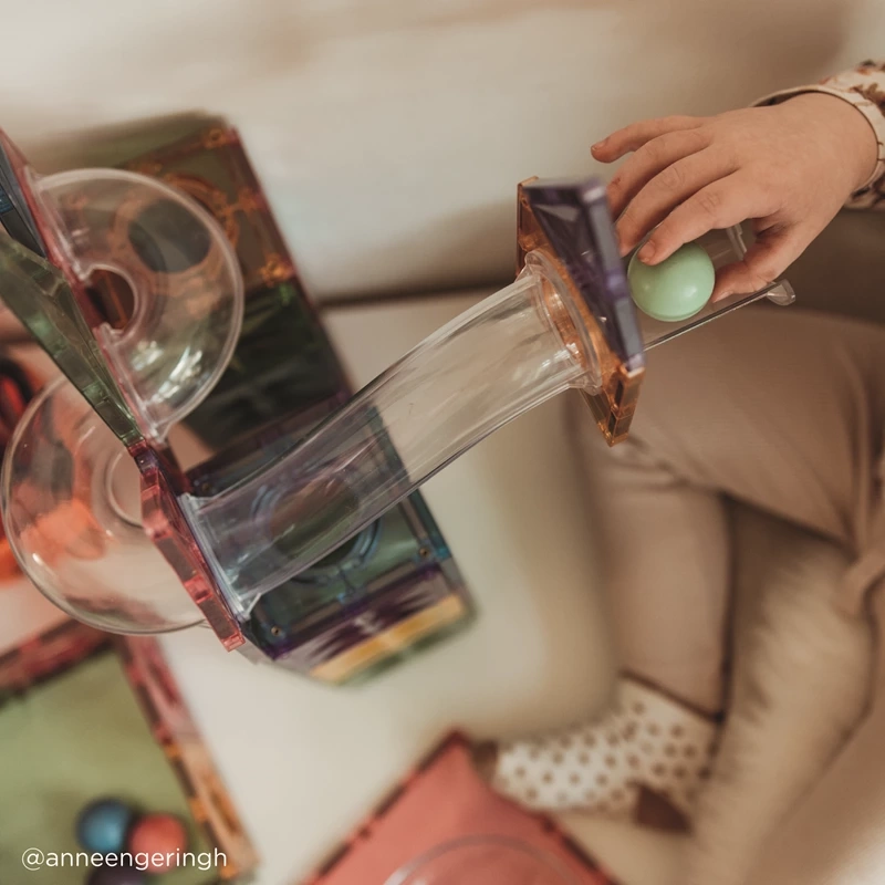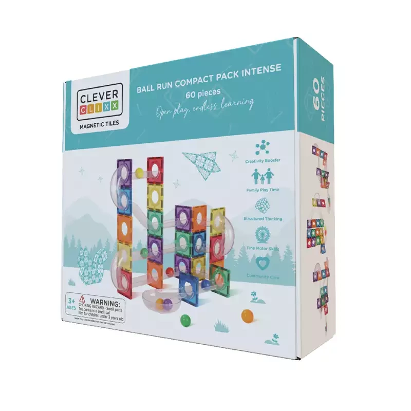 • Cleverclixx Ball Run Compact Pack Intense – 60-elementowy magnetyczny kulodrom. Twórz dynamiczne tory kulkowe i rozwijaj kreatywność dzieci od 3 lat.