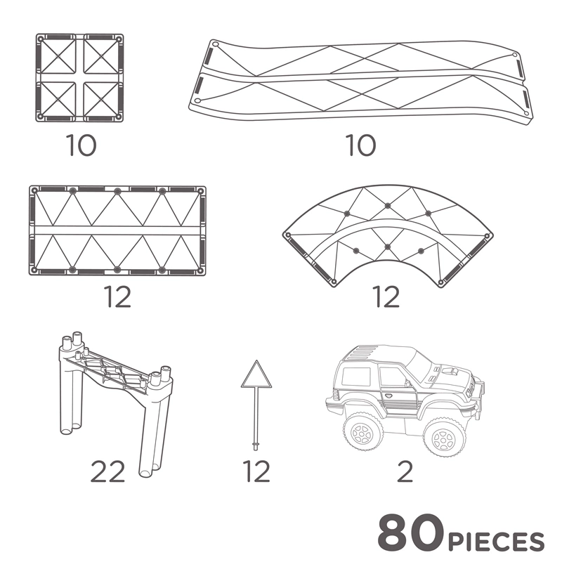 Large Race Track Pastel to 80-elementowy zestaw magnetycznych klocków, który pozwala dzieciom tworzyć wyjątkowe pastelowe tory wyścigowe. Zestaw zawiera wszystko, czego potrzeba do zabawy – od ramp i łuków po znaki drogowe, filary i dwa samochody. To idealna propozycja dla dzieci, które uwielbiają kreatywną zabawę pełną ruchu i emocji.