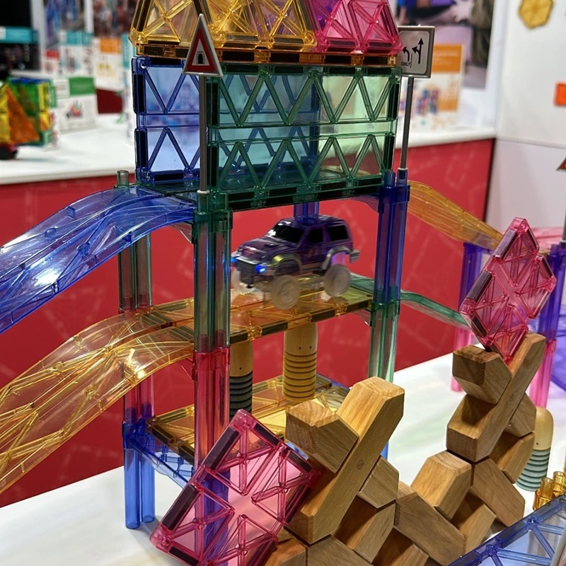 - Cleverclixx Large Race Track Pastel – 80-elementowy zestaw magnetycznych torów wyścigowych w pastelowych kolorach. Zawiera rampy, znaki drogowe i dwa samochody dla dzieci od 3 lat.