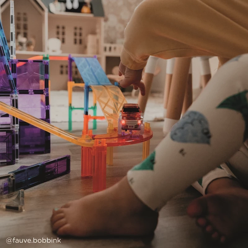 Płytki magnetyczne Cleverclixx dają dzieciom pełną swobodę zabawy – mogą budować tory wyścigowe, łączyć zestawy, a nawet tworzyć obrazki na metalowych powierzchniach. Dzięki otwartej formule zabawa pobudza wyobraźnię, uczy planowania i inspiruje do samodzielnego eksperymentowania.
