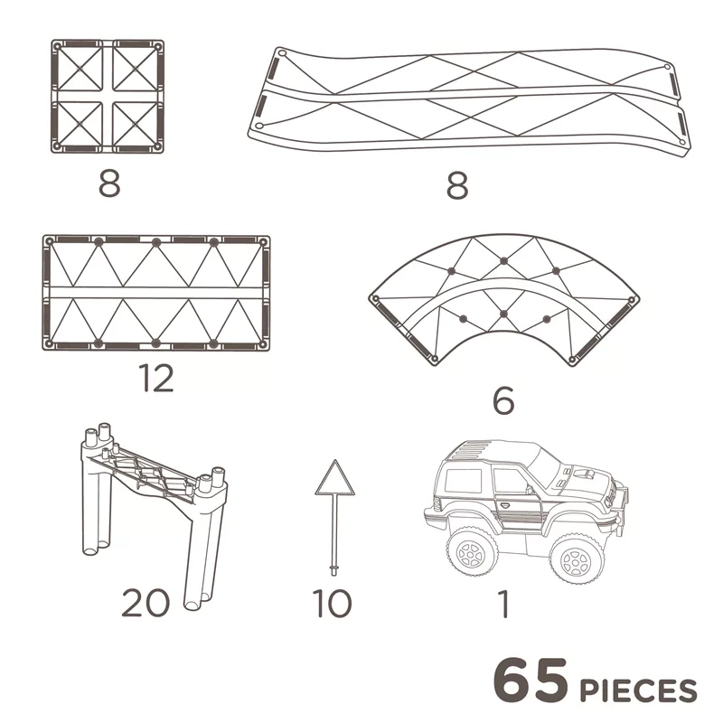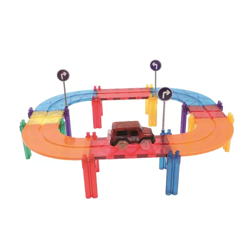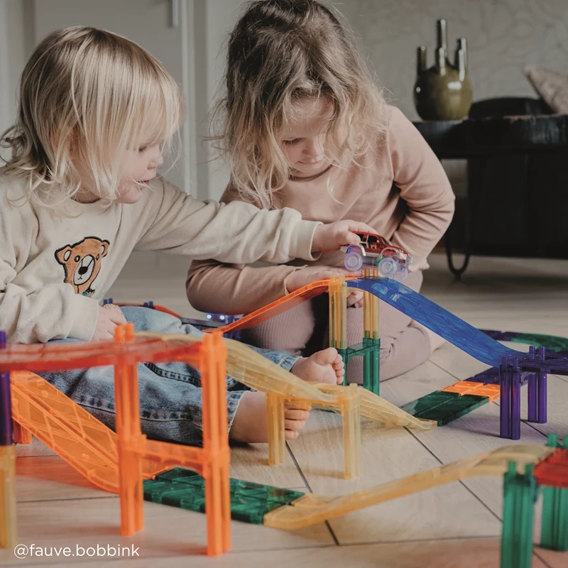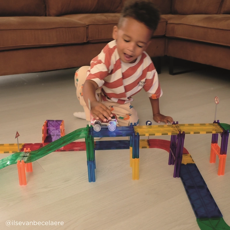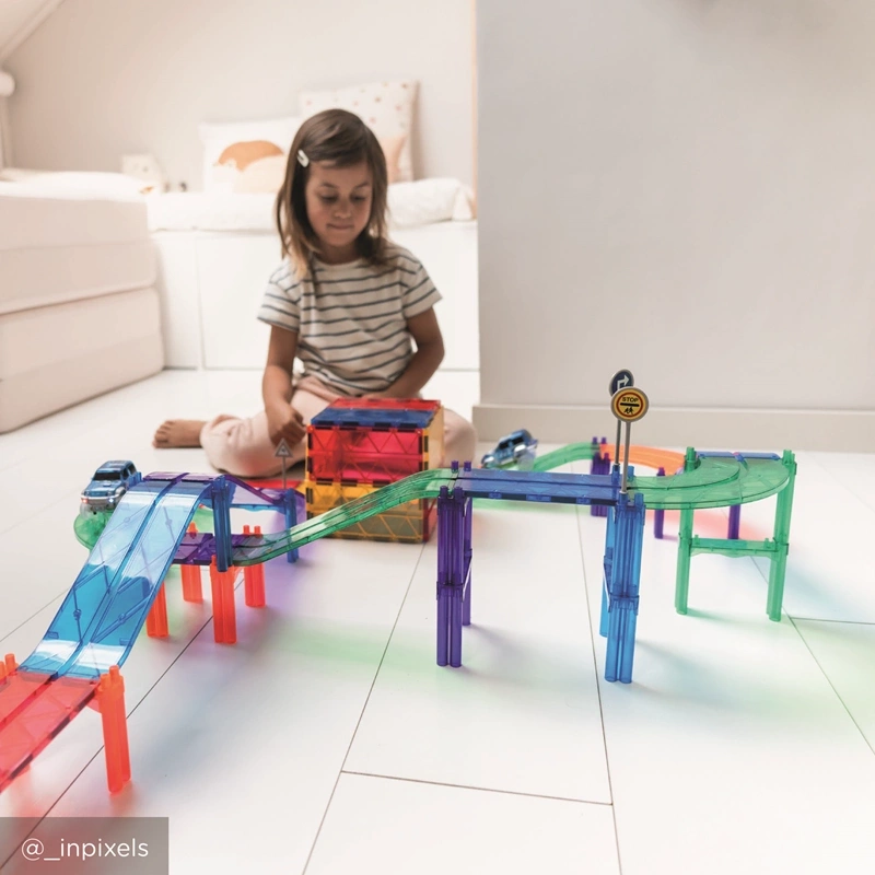 Race Track Intense to zestaw 65 magnetycznych elementów, który pozwala tworzyć wyjątkowe tory wyścigowe. Dzięki intensywnym kolorom i dołączonym akcesoriom – takim jak znaki drogowe, samochód i filary – dzieci mogą projektować własne trasy i cieszyć się dynamiczną zabawą pełną emocji. Zestaw zachęca do kreatywności i rozwijania zdolności manualnych.
