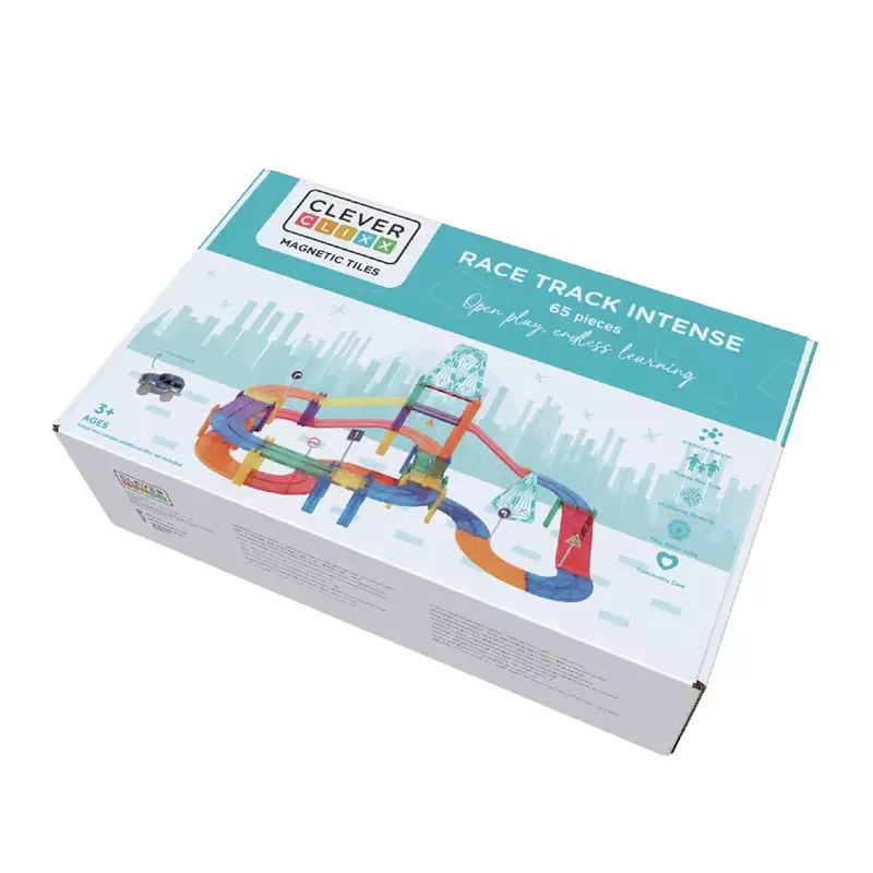 - Cleverclixx Race Track Intense – 65 magnetycznych elementów do budowy kolorowych torów wyścigowych. Zestaw z samochodem, rampami i znakami drogowymi dla dzieci od 3 lat.