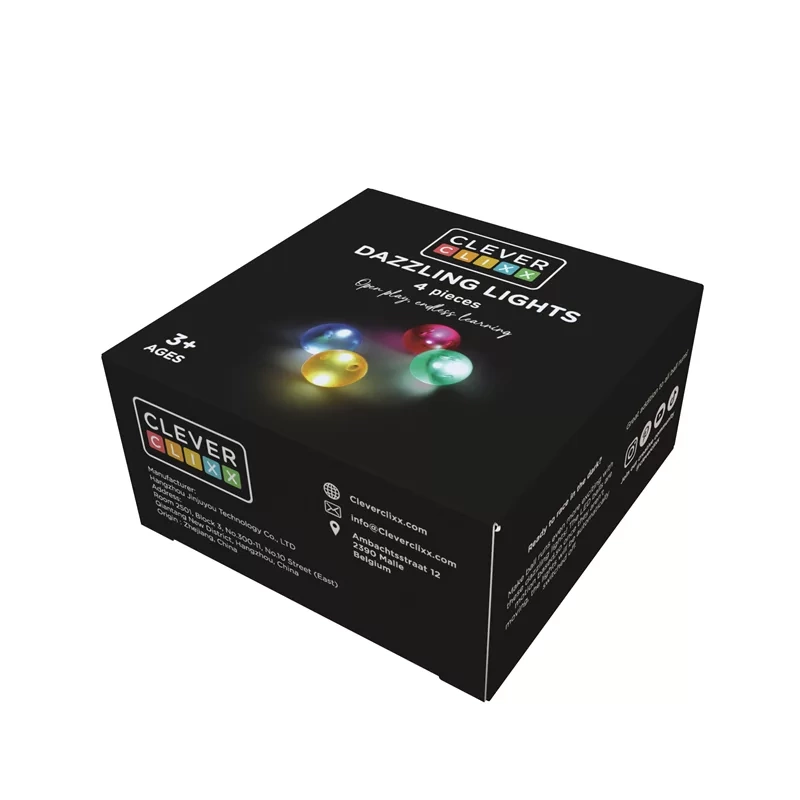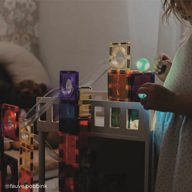 • Świecące kulki Cleverclixx Dazzling Lights – 4 elementy do kulodromu Cleverclixx. Kulki świecą w ruchu, pobudzają wyobraźnię i pasują do zestawów magnetycznych dla dzieci od 3 lat.