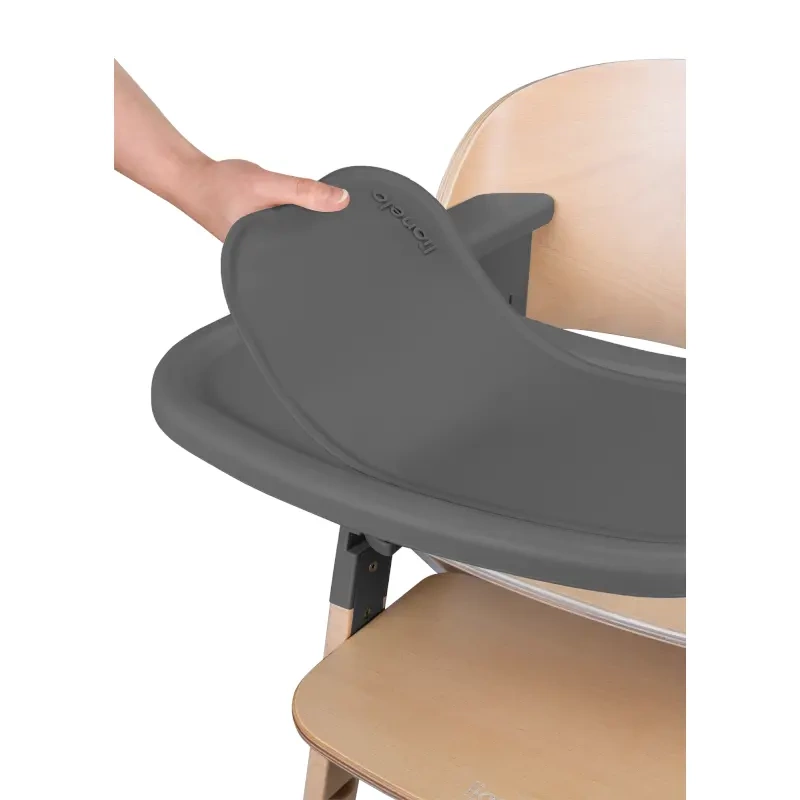 W zestawie znajduje się tacka z praktycznym wgłębieniem, które pomaga utrzymać jedzenie w zasięgu dziecka. Dołączona silikonowa nakładka z antypoślizgową powierzchnią może być używana zarówno na tacy, jak i bezpośrednio na stole. Jest łatwa w czyszczeniu i można myć ją w zmywarce.