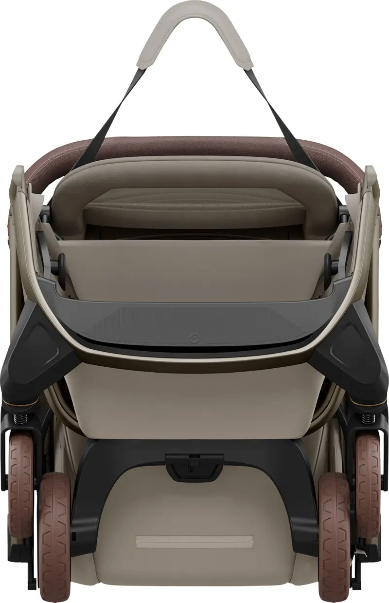 Wózek składa się jednym ruchem, nawet gdy w drugiej ręce trzymasz dziecko. Po złożeniu można go wygodnie przenosić na ramieniu dzięki zintegrowanemu paskowi.