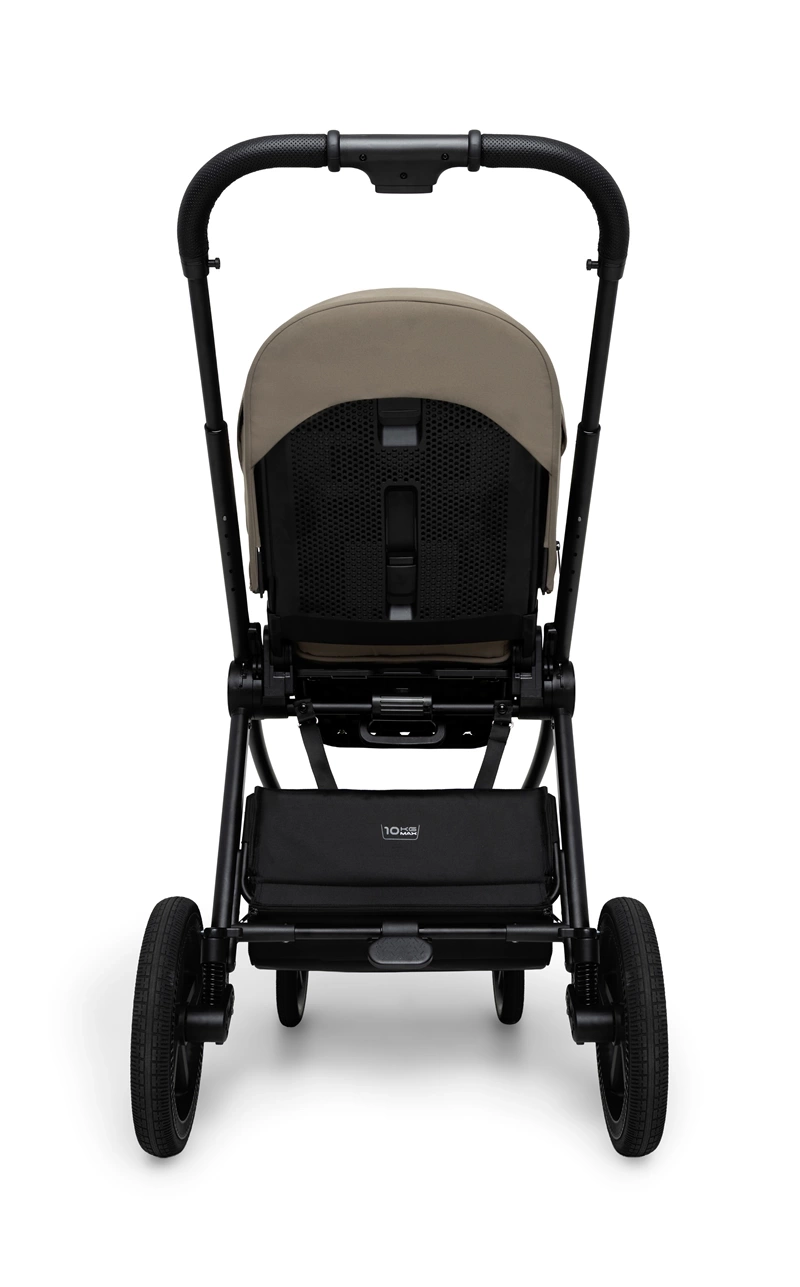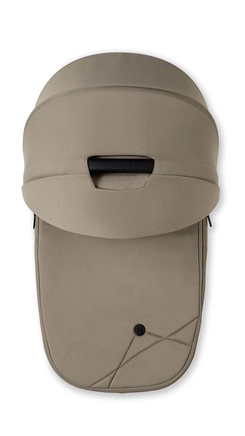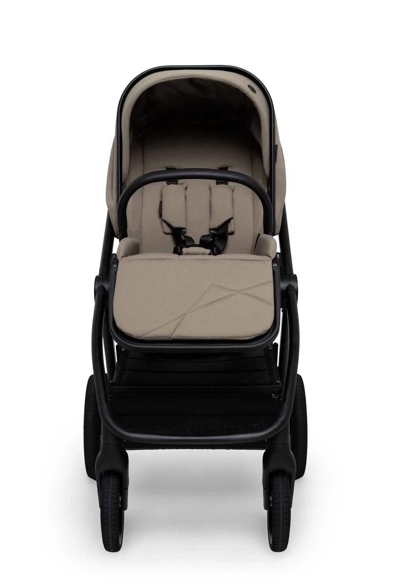 Tapicerka wykonana jest z hydrofobowej tkaniny, która nie wchłania wilgoci i jest łatwa w czyszczeniu. Filtr UPF 50+ chroni przed promieniami UV, a nowa struktura materiału z eleganckim tłoczeniem i metalowym pinem podkreśla charakter premium wózka.