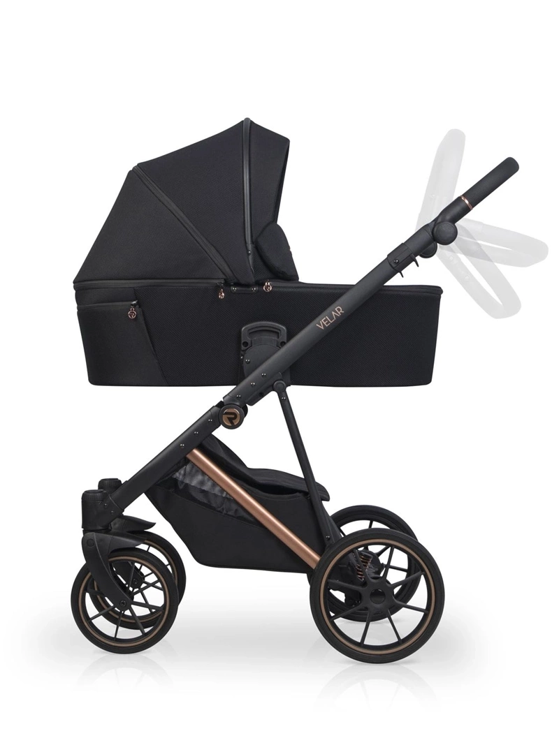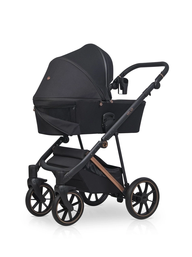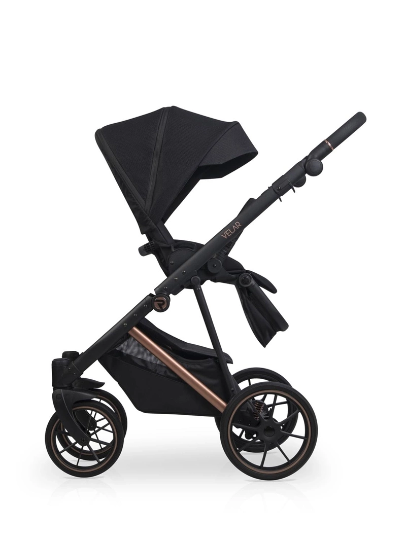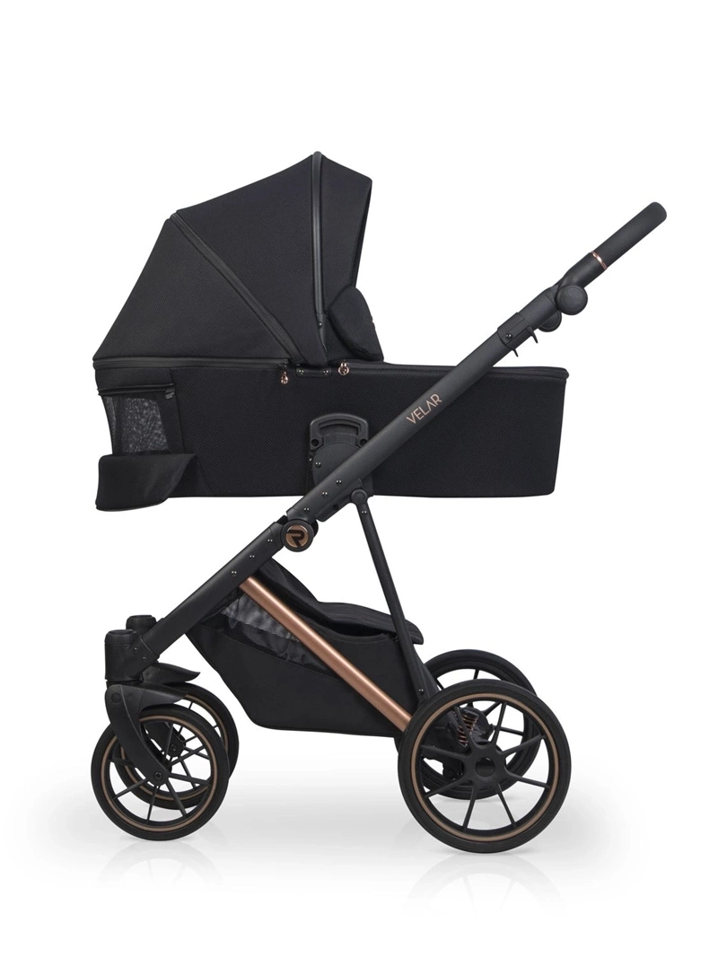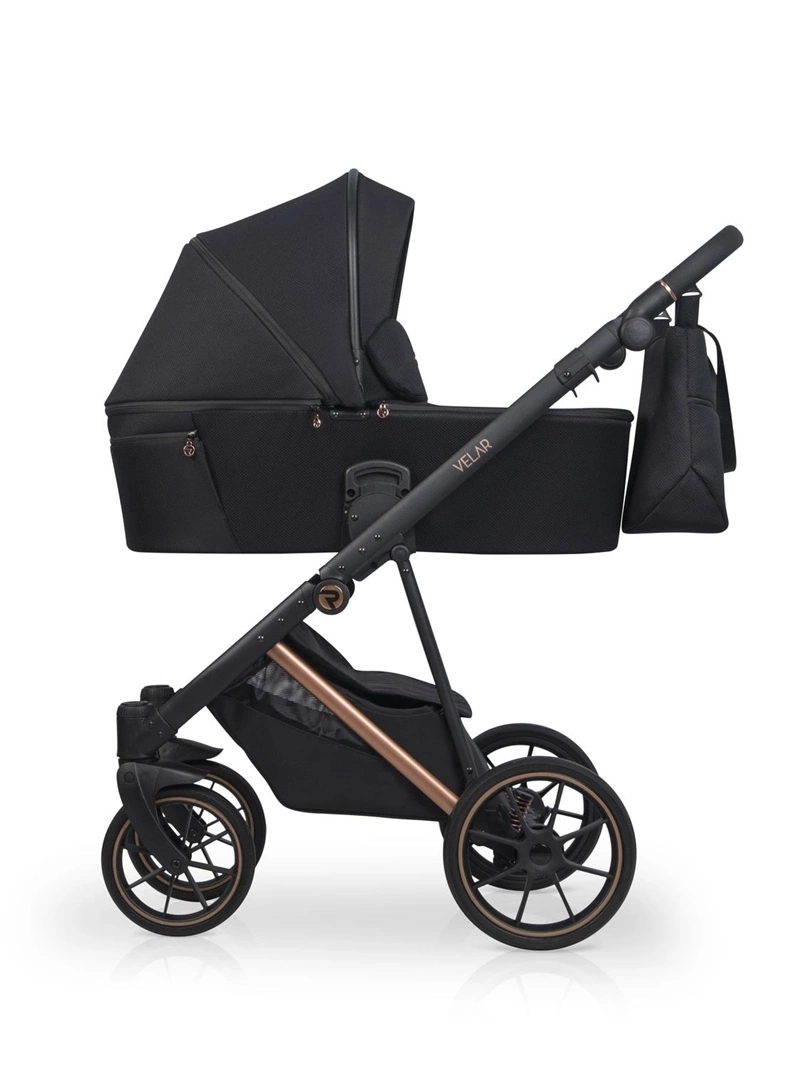 Wózek VELAR dostępny jest w kilku wersjach kolorystycznych, oferujących elegancki design i wysoką jakość wykonania. W zestawie z wózkiem znajdziesz praktyczne akcesoria, takie jak duża torba, pokrowiec na zimę, folia przeciwdeszczowa, moskitiera, kosz mocowany do stelaża wózka z klapką zamykaną magnesami oraz barierka zabezpieczająca dziecko.