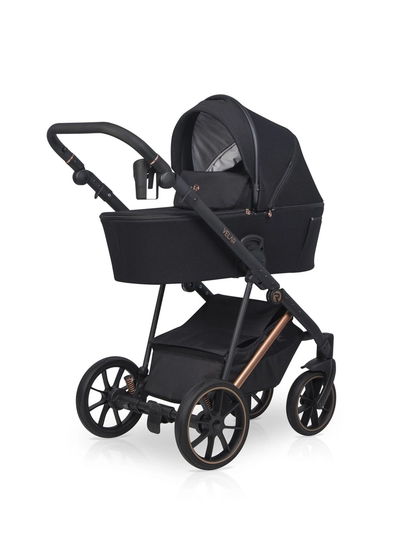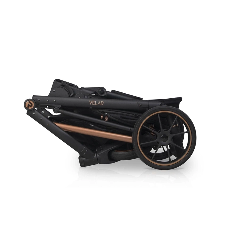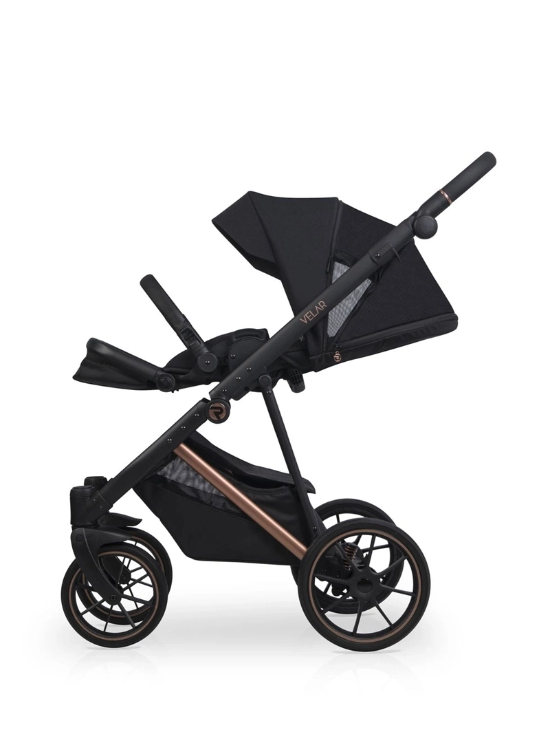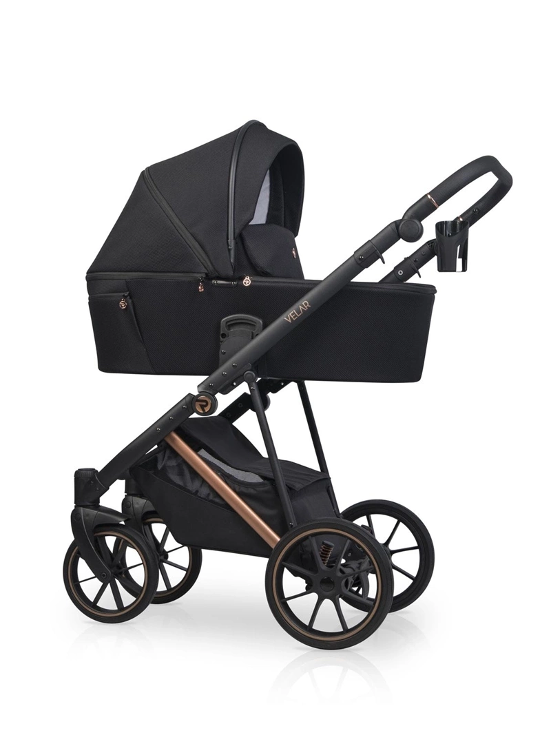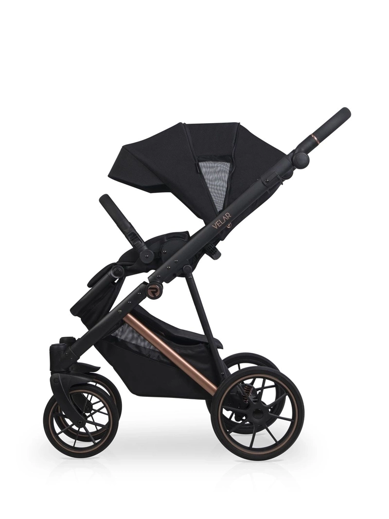 Wózek VELAR dostępny jest w kilku wersjach kolorystycznych, oferujących elegancki design i wysoką jakość wykonania. W zestawie z wózkiem znajdziesz praktyczne akcesoria, takie jak duża torba, pokrowiec na zimę, folia przeciwdeszczowa, moskitiera, kosz mocowany do stelaża wózka z klapką zamykaną magnesami oraz barierka zabezpieczająca dziecko.